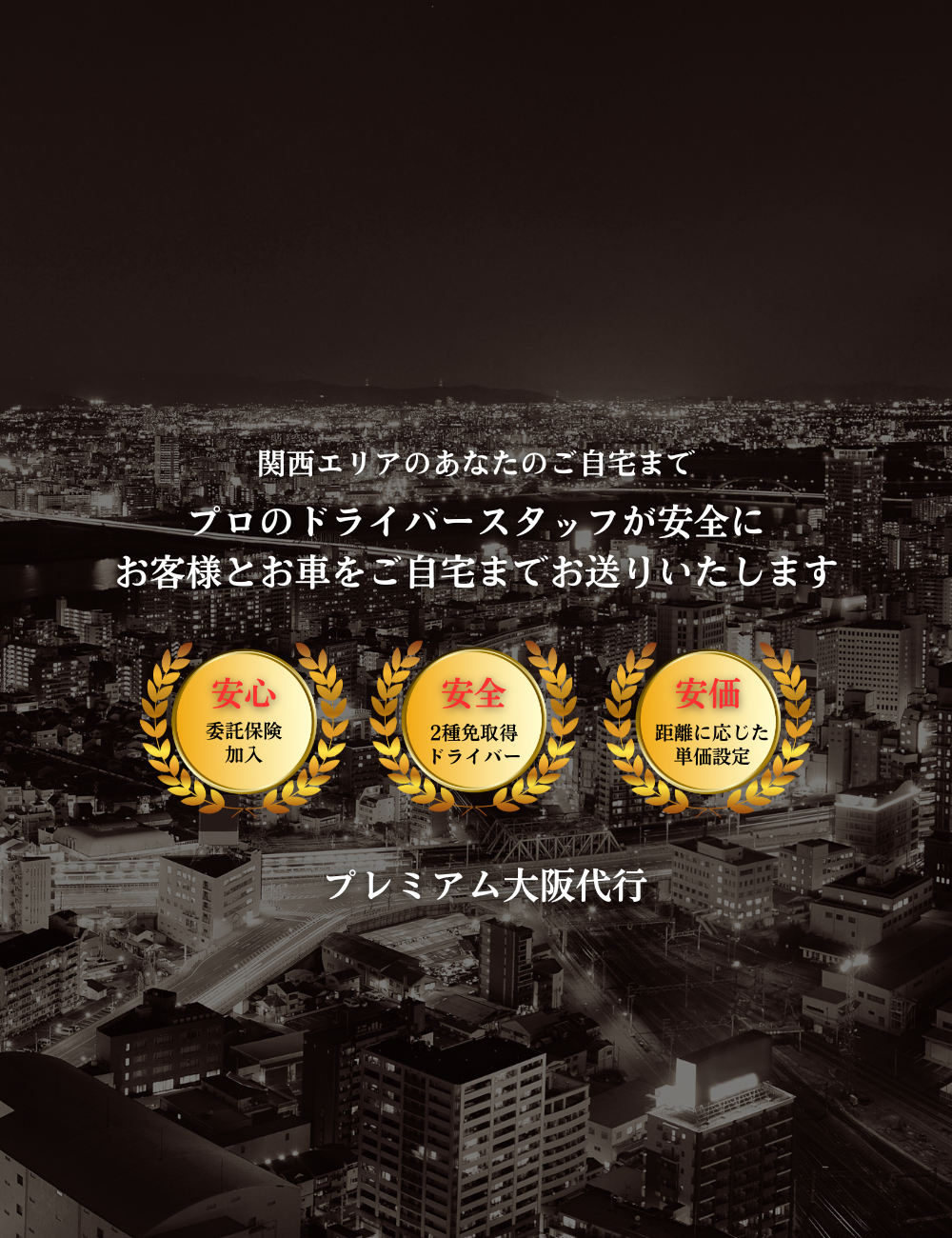 ご安心ください!プレミアムOSAKA代行の経験豊富なプロスタッフが、お客様とお車を安心・安全・確実にご指定の場所までお送りいたします。24時間対応のため、どの時間帯でもお気軽にご利用いただけます。